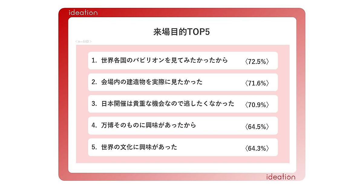 アイディエーションは、「大阪・関西万博」に関する調査結果を発表した。全国20代~60代の男女来場者440人が回答している。
