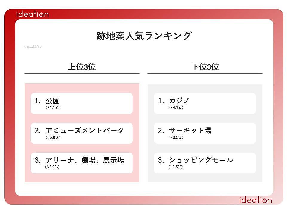 最後に、閉会した「大阪・関西万博の跡地利用」について聞くと、現在候補にあがっている計画案でもっとも評価が高かったのは「公園」71.1%が最多で、以下「アミューズメントパーク」65.0%、「アリーナ、劇場、展示場」63.9%が人気だ。逆に不人気ランキングでは「カジノ」34.1%が最多で、以下「サーキット場」20.5%、「ショッピングモール」12.5%があがっており、大阪IR構想に否定的な人たちの多さが浮き彫りとなった。