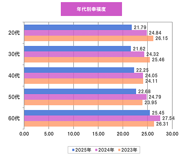 年代別に見ると、60代(25.45点)、50代(22.68点)、40代(22.25点)、20代(21.79点)、30代(21.62点)の順となり、年代が上がるにつれて幸福度が高くなる傾向が見られた。