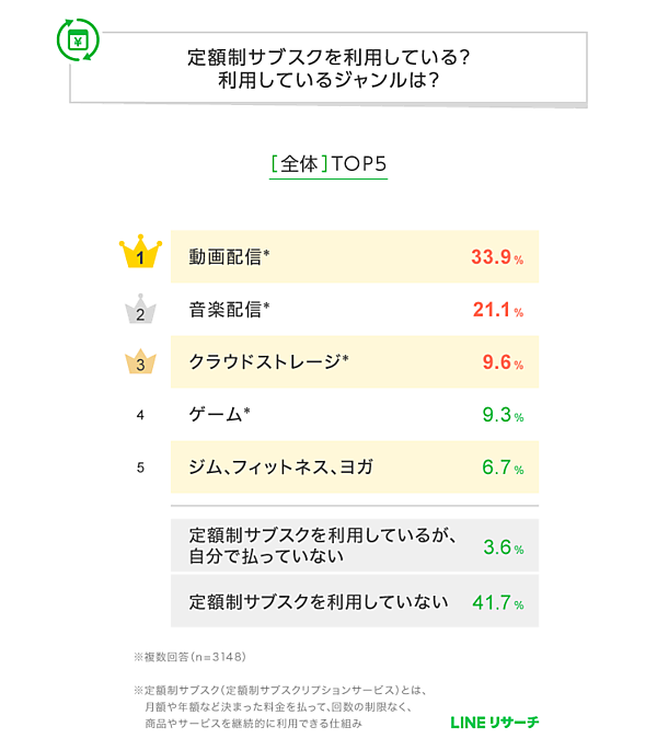 LINEヤフーが運営するリサーチプラットフォーム「LINEリサーチ」は、「定額制サブスクリプションサービスの利用状況」についての調査を実施した。15歳~69歳の男女3148名が回答している。