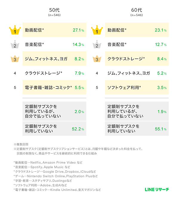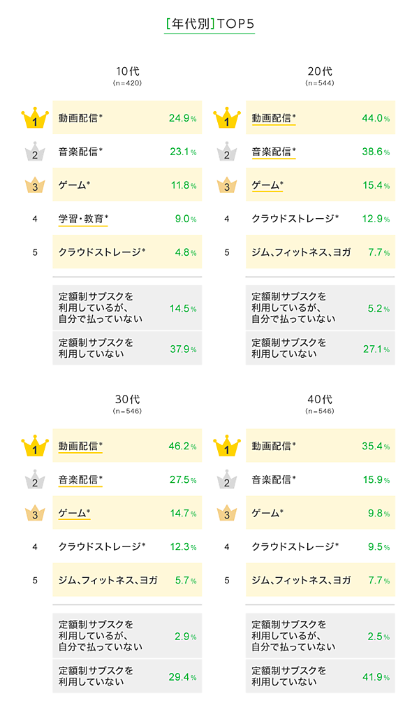 年代別で見ると、すべての年代で「動画配信」「音楽配信」が上位2つを占めた。特に「動画配信」は20代で44.0%、30代で46.2%と高い割合を示している。また、若年層では「ゲーム」が3位に入った一方で、50代では「ジム、フィットネス、ヨガ」が3位に。「クラウドストレージ」はすべての年代で上位にランクインしていた。