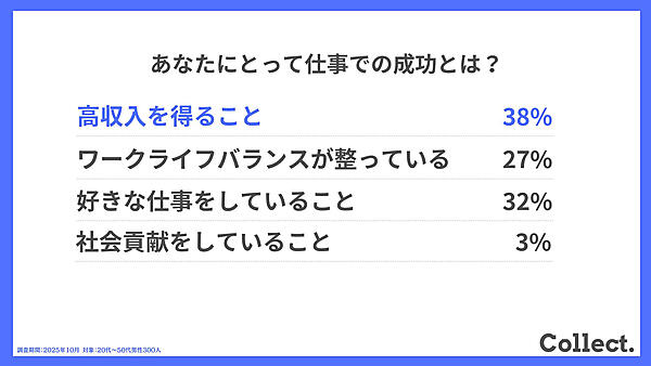 まず「あなたにとって仕事での成功とは?」と聞くと、「高収入を得ること」38%が最多で、「好きな仕事をしていること」32%、「ワークライフバランスが整っていること」27%が続く。“収入・やりがい・生活”の三軸が重視されているようだ。