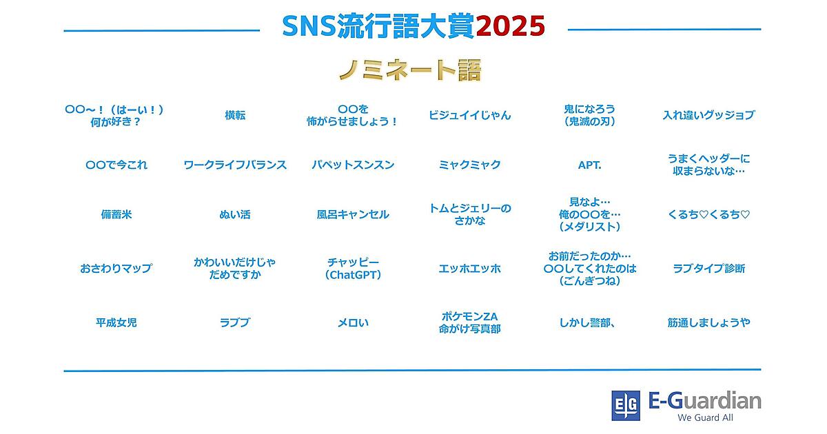 セキュリティ企業のイー・ガーディアンは、「SNS流行語大賞2025」のノミネートワード30語を発表した。2025年(2025年1月1日~10月31日)にX上で頻繁に使用されバズったフレーズを独自集計したもので、2025年で7回目。