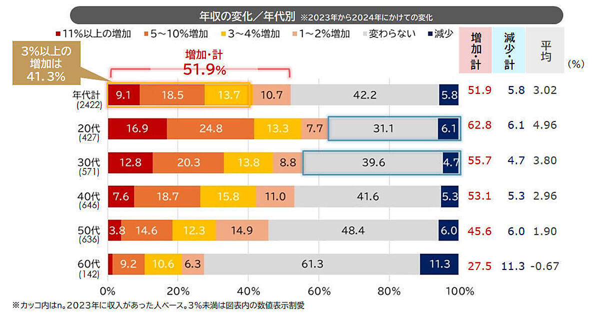 まず「年収の変化」(2023年→2024年の変化)について聞くと、「増えた」という人は51.9%。3%以上の増加は41.3%だった。一方「変わらない」も42.2%と半数近くを占める。年代別で見ると、20~30代の若年層であっても、3割ほどが「変わらない」と回答していた。