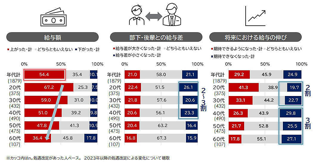 「給与額」「部下・後輩との給与差」「将来における給与の伸び」の変化について聞くと、給与額が上がった人の割合は、年代が高いほど低い。また40代以下の2~3割が「部下・後輩との給与差が小さくなった」と回答している。また、30代以下の約2割、40代以上の約3割は「この先の給与の伸びが期待できなくなった」と回答している。