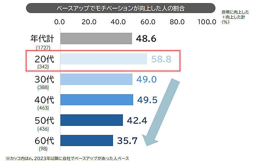 賃上げとモチベーションの関係を見るため「ベースアップでモチベーションは向上したか」を聞くと、モチベーションが向上した人は48.6%と半数に満たない。年代別では、年代が高いほどモチベーションが向上した人の割合が低かった。