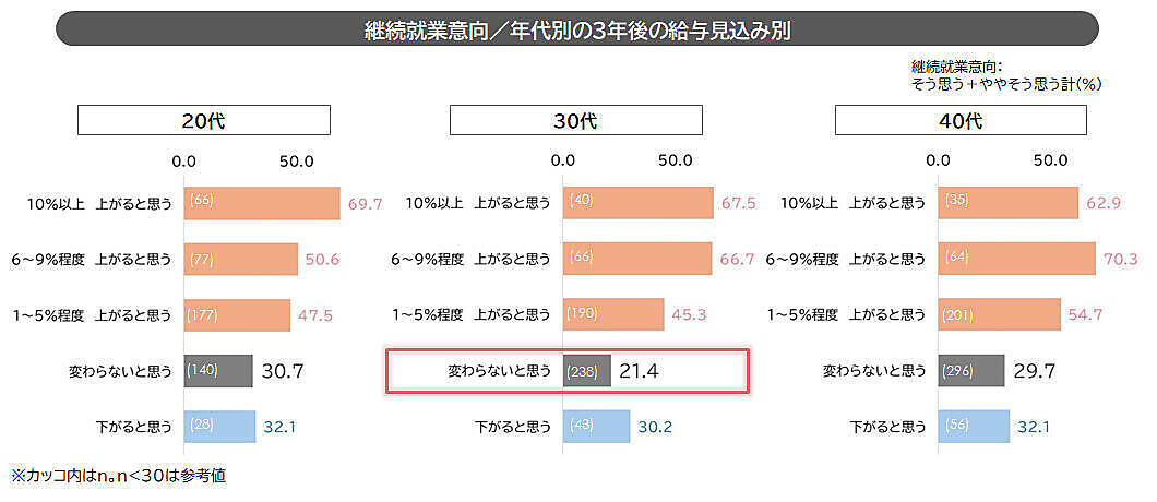 また将来の見通しについて、40代以下の層に絞って「3年後の給与見込みと継続就業意向」を聞くと、3年後の給与が「変わらない」と感じる層では継続就業意向は27.0%だった。一方「下がる」と感じる層も31.5%でほぼ同水準。