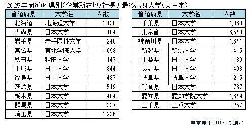 2025年の社長の出身大学ランキングは、「日本大学」が1万9,587人で15年連続の1位となった。2位は「慶應義塾大学」で1万819人、3位は「早稲田大学」で1万625人と続いている。1万人を超えているのは上位3校のみとなり、「明治大学」「中央大学」「法政大学」が追いかけた。なお、国公立大学では、「東京大学」が4,700人で7年連続10位にランクインした。
