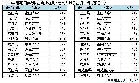 東京商工リサーチは、2025年「全国社長の出身大学」調査を実施した。本調査は2010年に開始し、今回が15回目となる。