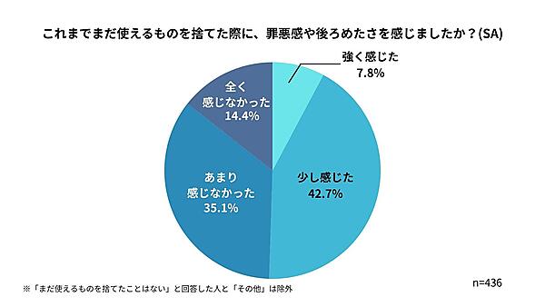 最後に、まだ使えるものを捨てた際に罪悪感や後ろめたさを感じたかを聞くと、「強く感じた・少し感じた」の合計は50.5%にのぼった。一方で、「感じなかった」も半数を占めており、捨てることへの意識が二分していることが明らかになった。