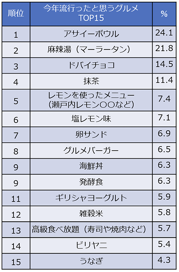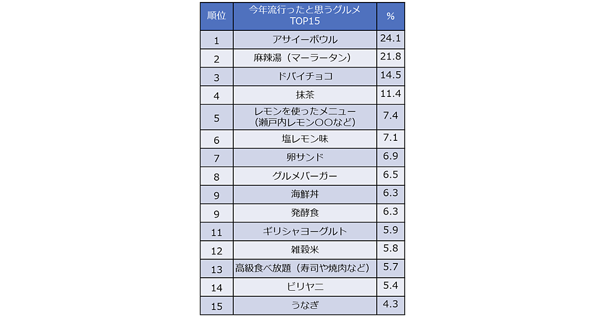 調査によると、今年流行ったと思うグルメの1位は「アサイーボウル」、2位は「麻辣湯」、3位は「ドバイチョコ」となった。上位3つはいずれも韓国のSNSで話題になった商品で、日本ではコンビニやスーパーなどでも販売が広がり、手に取りやすくなったことが人気につながっている。以下、「抹茶」や「レモンを使ったメニュー」などが続いた。