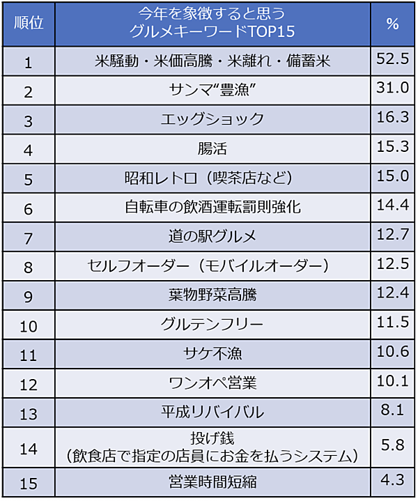 また、「今年を象徴すると思うグルメキーワード」を聞くと、「米騒動・米価高騰・米離れ・備蓄米」が52.5%で圧倒的なトップに。備蓄米放出が連日報道され、米価格の高騰や供給不安が続いたことが背景にある。2位は「サンマ“豊漁”」、3位は「エッグショック」と続き、物価の乱高下を感じられるようなキーワードが並んだ。