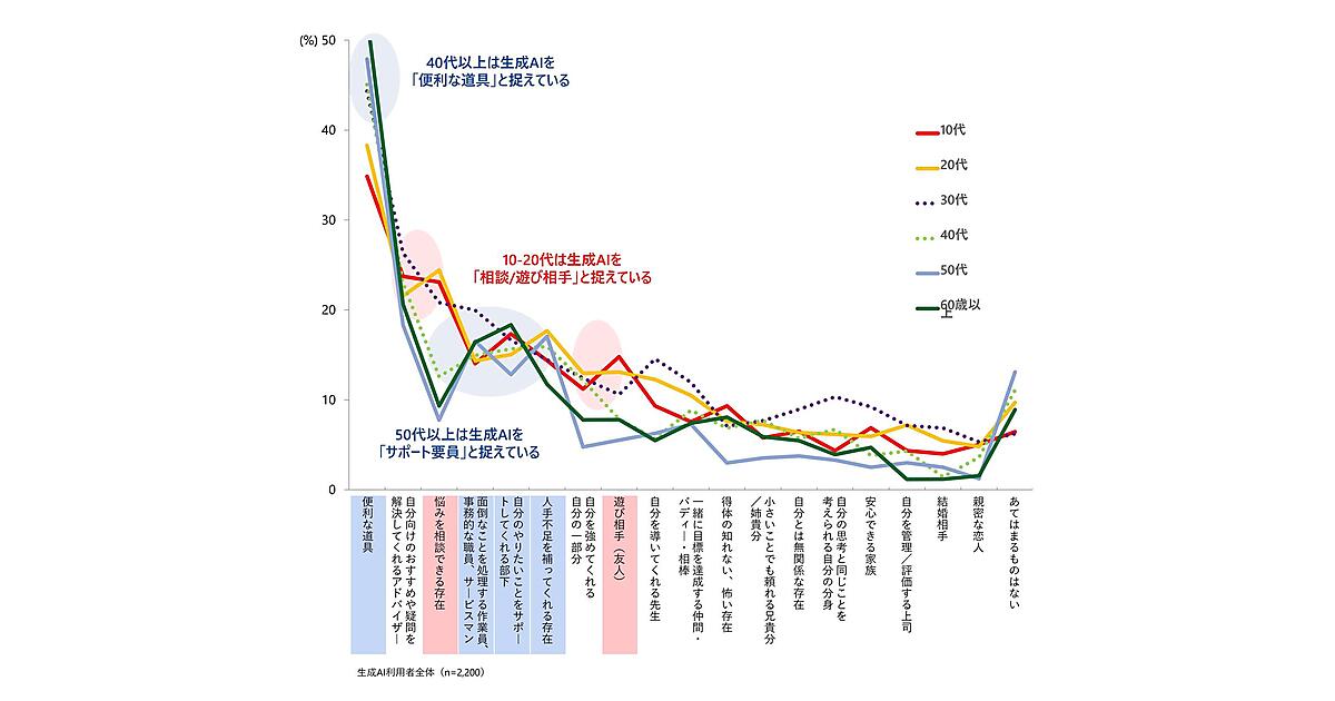 「生成AIはどのような存在か」については、「便利な道具」43.6%が最多。以下「アドバイザー」22.2%、「悩みを相談できる存在」16.6%が続く。年代別だと、10代は「便利な道具」が多いが、「悩みを相談できる存在」「遊び相手」が比較的高い。一方50代以上は、生成AIを「便利な道具」「サポート要員」と割り切っている。