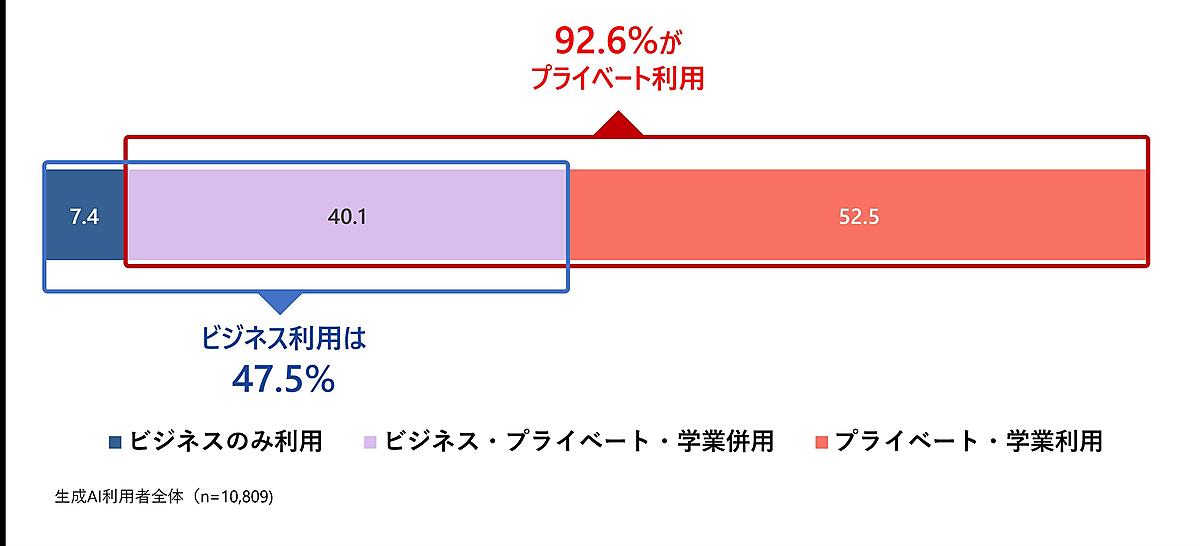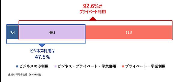 生成AI利用者に「ビジネスとプライベート・学業と、どちらで利用しているか」(重複あり)を聞くと、「ビジネスのみ利用」7.4%、「プライベート・学業のみ利用」52.5%、「両方で利用」40.1%となり、意外にも9割以上がプライベート・学業での利用を示した。