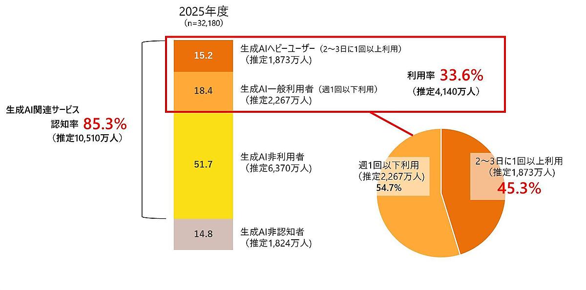 生成AI関連サービスの利用率は全体の33.6%だった。内訳はヘビーユーザー(2~3日に1回以上)が15.2%、一般ユーザー(週1回以内)が18.4%。なお、サービス認知率は全体の85.3%に達した。