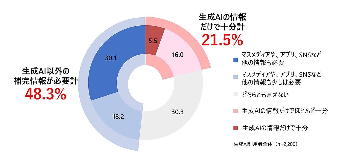 一方で「マスメディアや、アプリ、SNSなどで情報を得なくても、生成AIを使ったAIサービスで情報を得るだけで十分か」と聞くと「生成AIの情報だけで十分」は21.5%にとどまり、48.3%は「生成AIが提供する情報に加えて、他からの補完情報も必要」と回答している。