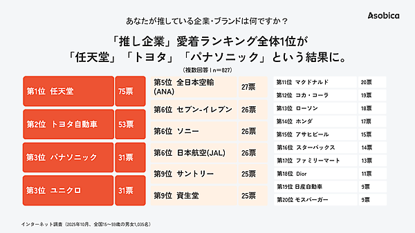 具体的な企業・ブランド名を見ると、1位は「任天堂」で75票、2位は「トヨタ自動車」で53票となり、3位以下を大きく引き離した。以下、「パナソニック」「ユニクロ」「セブンイレブン」など一般消費者向けの製品が数多くランクインしており、日常生活での接点の多さや品質の高さがファン獲得につながっているようだった。