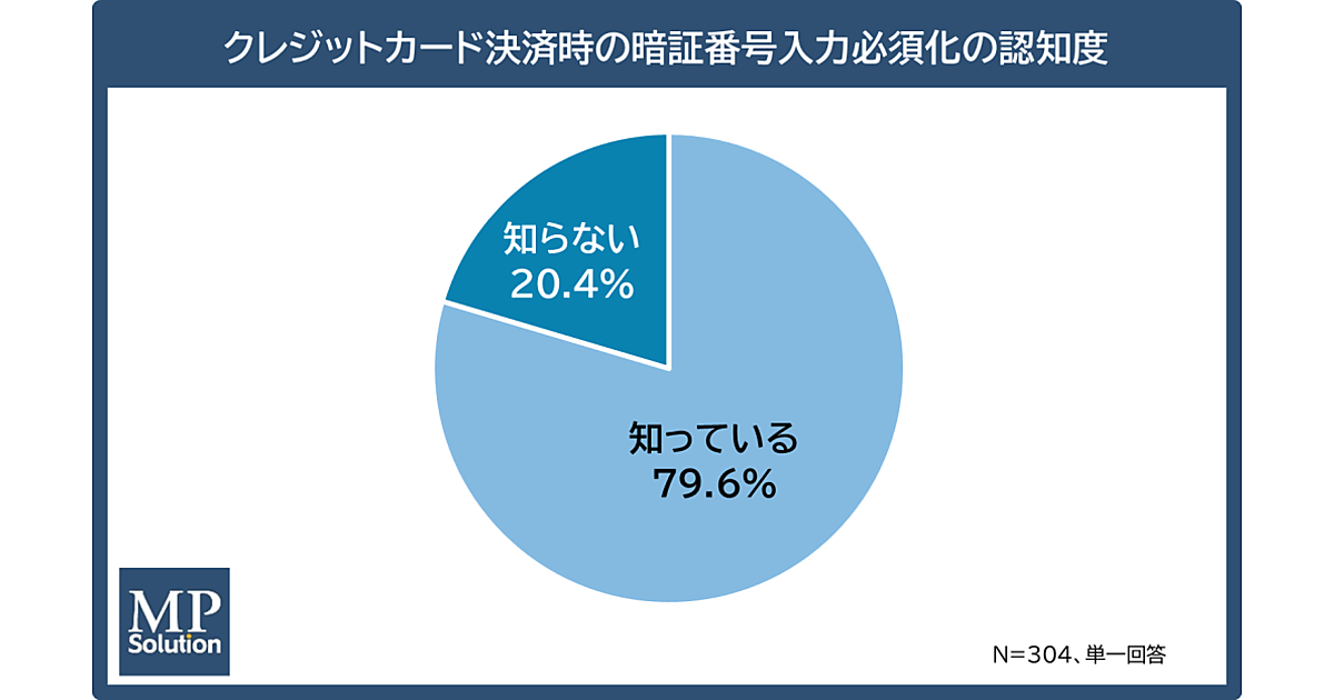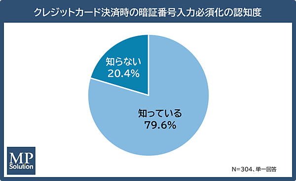 まず、2025年4月に施行された「クレジットカード決済時の暗証番号入力必須化」の認知度を聞くと、「知っている」と回答した人は79.6%となった。一方、「知らない」と回答した人は20.4%存在し、制度施行から約半年が経過する中、制度の周知や浸透に課題があることがわかった。