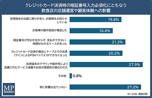 暗証番号入力必須化に伴い、飲食店の店舗運営や顧客体験にどのような影響が出ているかを聞くと、「決済端末のデザインや操作性により、洗練されたサービス体験やお店の雰囲気が損なわれた」が27.9%にのぼった。その他、「お客様をお待たせしてしまう」「操作負担が増加」といった意見も見られた。