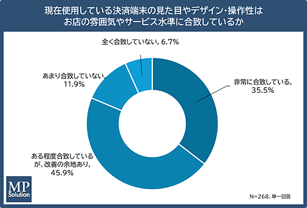 また、現在導入している決済端末についての満足度を聞くと、「見た目やデザイン・操作性がお店の雰囲気やサービス水準に合致している」は35.5%にとどまり、「改善の余地がある・合致していない」は64.6%にのぼった。
