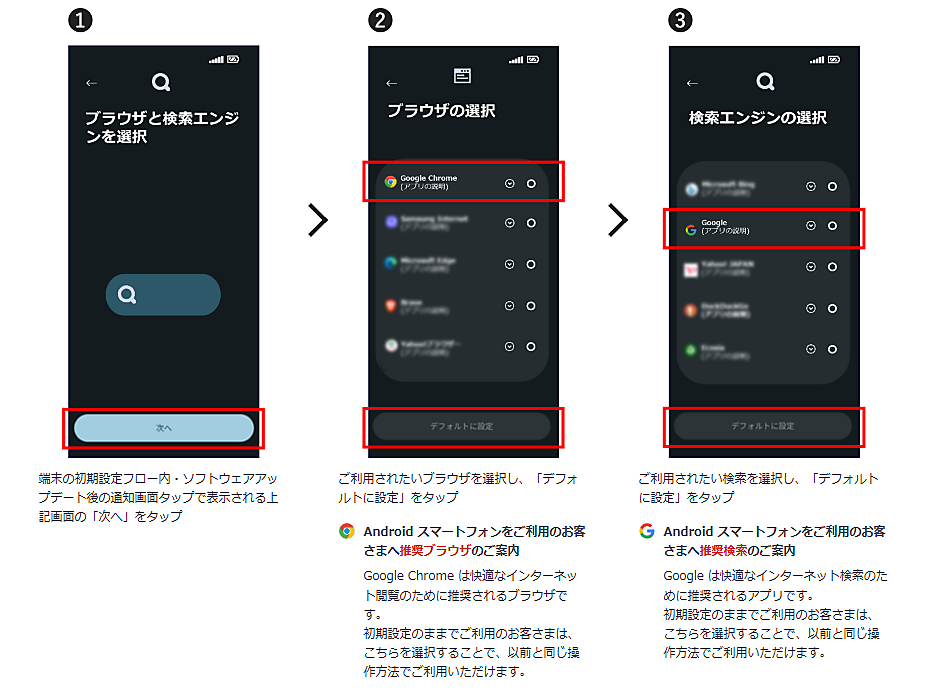 KDDIの案内文は「au」「UQ mobile」「povo1.0」「povo2.0」のユーザーが対象。各機種で順次実施されるソフトのアップデート後か、端末の初期設定時にブラウザと検索エンジンを選ぶ選択画面(チョイススクリーン)が表示される。KDDIはまず「Android」スマホについて表示予定端末や選択画面の操作を説明。利用したいブラウザ、検索エンジンを選び「デフォルトに設定」をタップする。