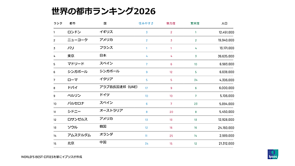イプソスは、「世界のベスト都市レポート2026」を公開した。レゾナンス社の協力のもと、住みやすさ・魅力度・繁栄度などの項目について、世界270以上の都市から特に評判の高い100都市を選出している。