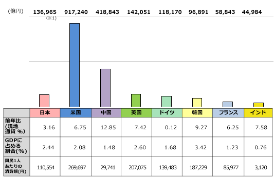 GDP(国内総生産)に占める割合を見ると、日本は2.44%で米国をやや上回った。韓国は3.42%、英国は2.60%とさらに高い数値が続いている。一方、国民1人あたりの年間消費額で比較すると、日本は米国・英国・韓国・ドイツに次ぐ5番手に。米国の40%以下で、英国の約50%という結果だった。