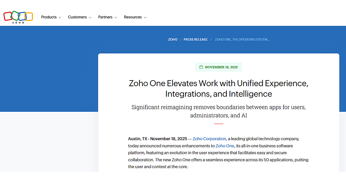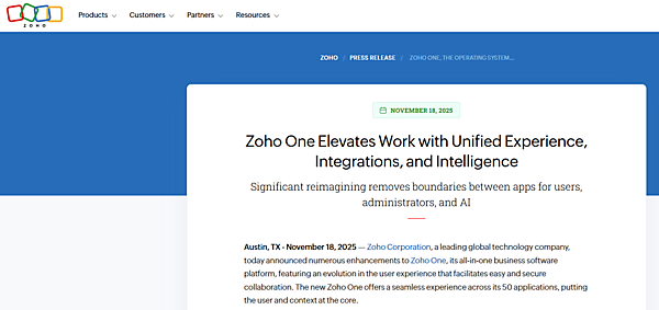 インドZoho Corporationの日本法人、ゾーホージャパンは12月4日、統合型クラウドプラットフォーム「Zoho One」の大幅アップデートを発表した。50以上の業務アプリケーションを横断する新しいユーザー体験(UX)と、AI(人工知能)機能を強化した。全アプリを横断する新UXや統合検索、ナビゲーションを再設計し、独自AI「Zia」を組み込むことで「アプリを使う」から「仕事が進む」 への転換を実現して企業の業務全体を支援する。