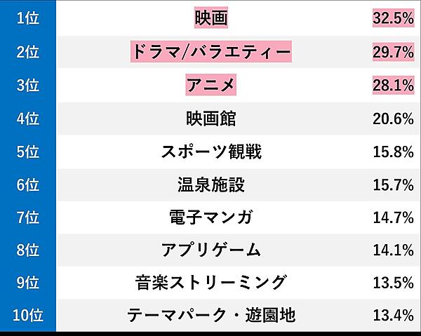 まず「好きなエンタメコンテンツ」は、1位「映画」32.5%、「ドラマ/バラエティー」29.7%、「アニメ」28.1%をあげる人が多く、動画系コンテンツが上位を独占した。4位に「映画館」20.6%もランクインしており、エンタメユーザーをもっとも惹きつけるのは「動画」といえる。