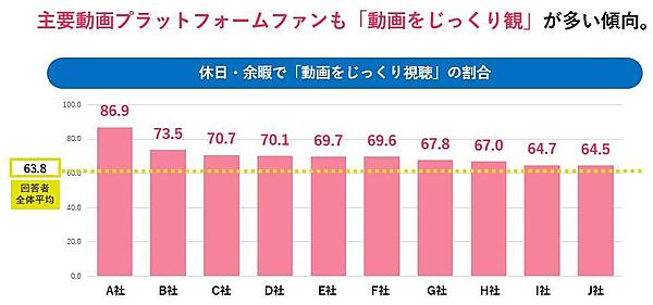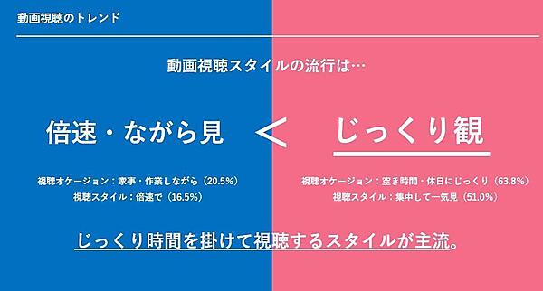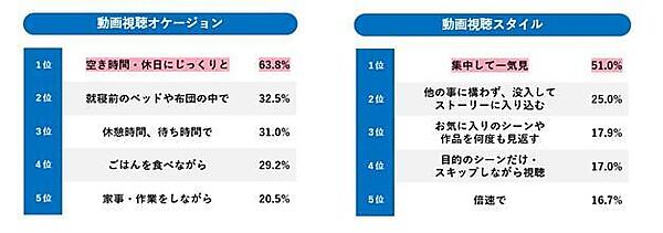 「動画視聴スタイル」について「ながら見・倍速」か「じっくり・集中して一気見」かどちらのスタイルかを聞くと、全世代において「じっくり・集中して一気見」のほうが多かった。空き時間の21時~22時、あるいは休日などに動画を見ている人が主流といえる。