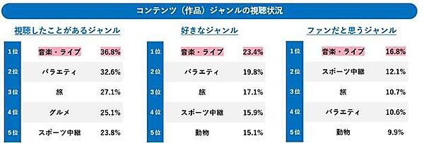 動画コンテンツの「視聴したことがあるジャンル・好きなジャンル・ファンだと思うジャンル」については、いずれも「音楽・ライブ」が最多。“音楽オーディション×リアリティショー”が人気のようだ。