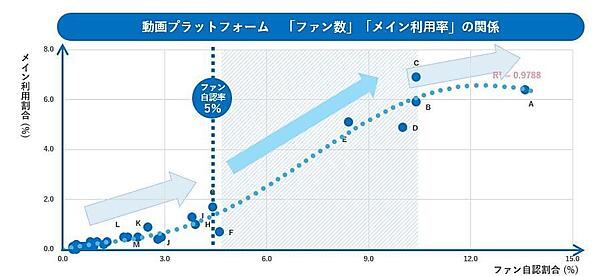こうした背景をもとに、ADKマーケティング・ソリューションズでは動画コンテンツファンを「心理軸(ファン自認率)」と「経済軸(メイン利用率)」をグロースカーブで観測。ファン自認率の割合が回答者全体のうち5%前後を超えると、メイン利用率の伸び率が加速し、グラフがS字のカーブを描いていた。またファン割合が5%~10%では縦軸(メイン利用割合)の伸び率が加速しており、早期のファン育成が重要であることが示されているとのこと。