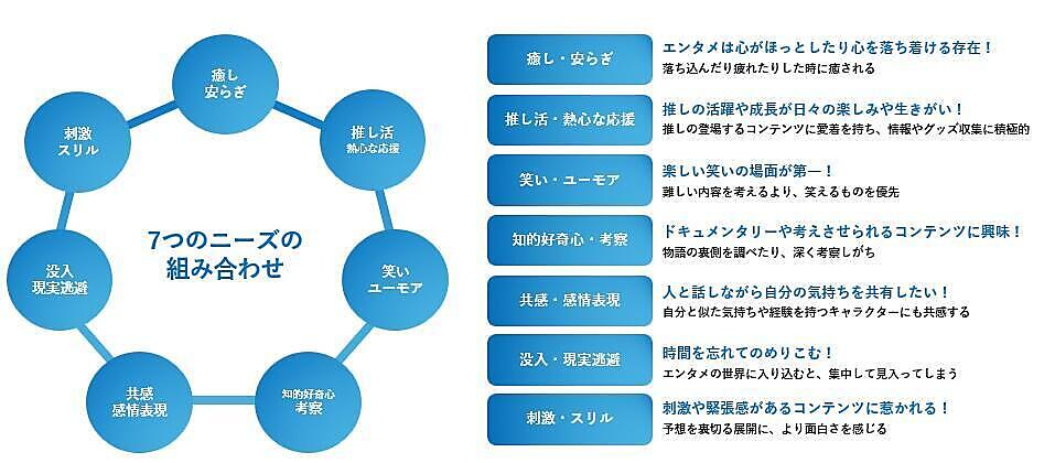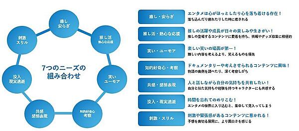 さらにエンタメユーザーの主要ニーズを分析すると、「7つのニーズ」に分類可能という。