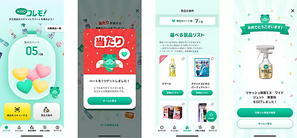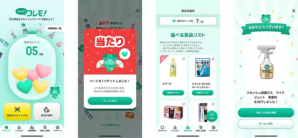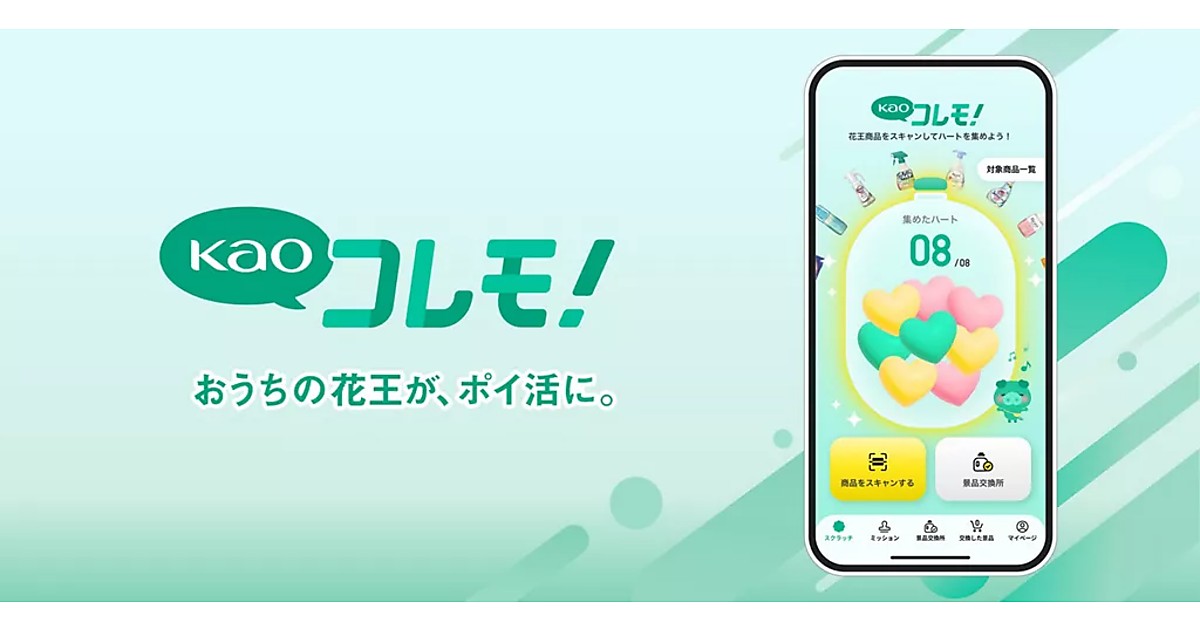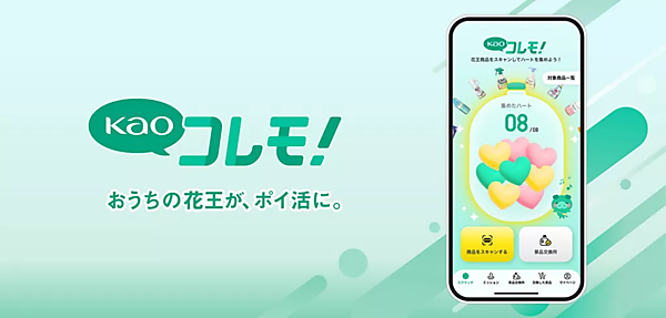 Kaoコレモ!は、自宅などの花王商品のバーコードをスキャンするとスクラッチくじに挑戦でき、当たりが出るとポイント(ハート)がたまる仕組み。ポイントはアンケートの回答や動画広告の視聴でも得られる。ためたポイントは、提示される候補の中から好みの花王商品と交換でき、商品3つの交換が完了した後、自宅に送料無料で届ける。