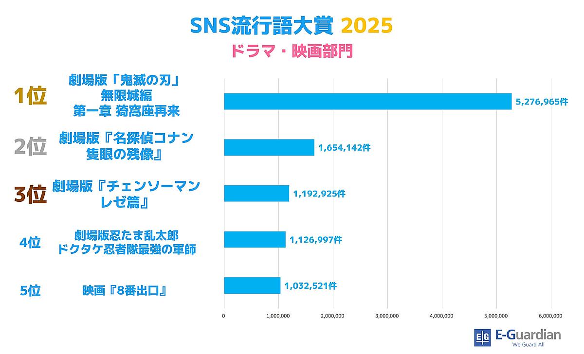 セキュリティ企業のイー・ガーディアンは、「SNS流行語大賞2025」を発表した。2025年(2025年1月1日~10月31日)にX上で頻繁に使用されバズったフレーズを独自集計している。またカテゴリごとに、ゲーム部門、漫画・アニメ部門、ドラマ・映画部門、食べ物・モノ部門の集計も行っている。