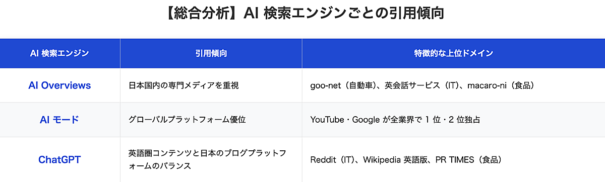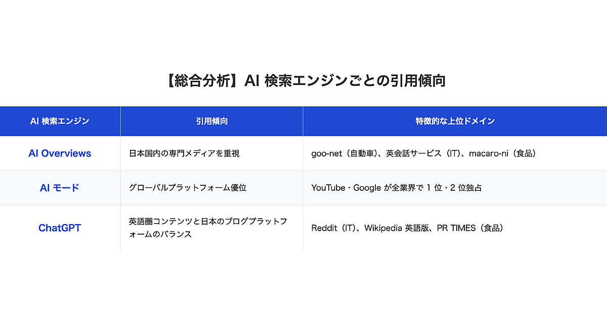まず、AI検索エンジンごとの引用傾向を分析したところ、以下のような特徴が見られた。