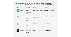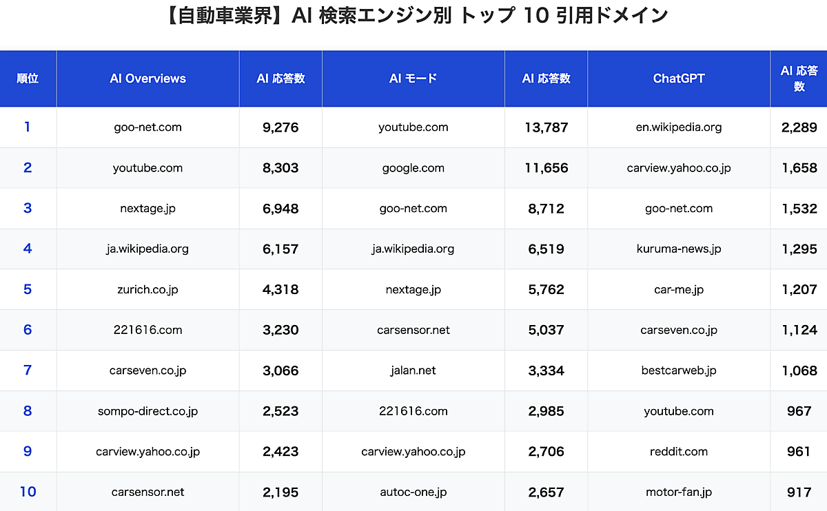 自動車業界では、AI Overviewsは「goo-net」「nextage」など日本の中古車情報サイトを多く引用。一方で、AI モードでは「YouTube」「Google」が圧倒的に強く、ChatGPTでは「英語版Wikipedia」が最多となった。