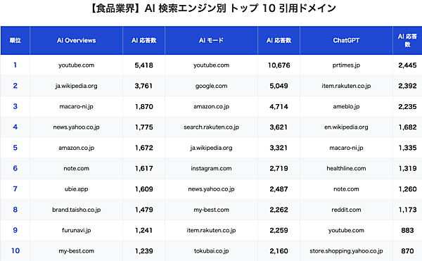 食品業界では、AI モードは「Amazon・楽天」といったECサイトや「Instagram」が上位にランクイン。AI Overviewsでは「macaro-ni.jp」などのレシピメディアが3位に入り、ChatGPTでは「PR TIMES」のプレスリリース経由の引用が1位となった。