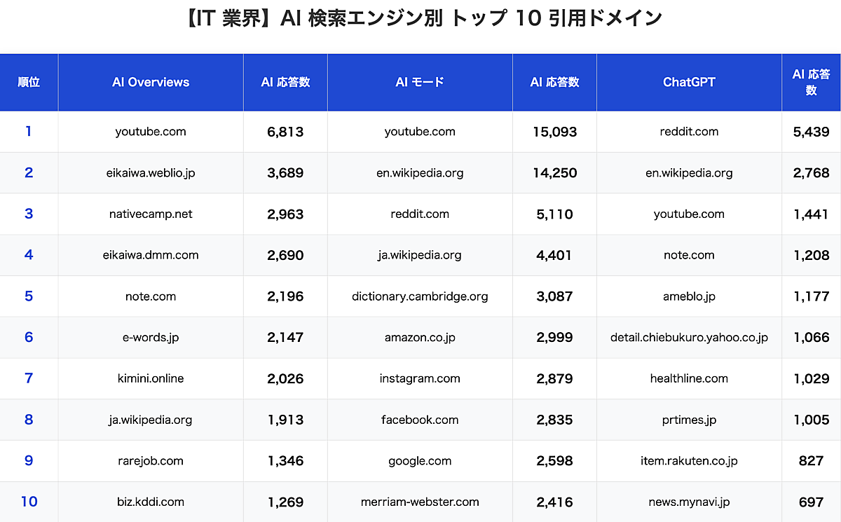 IT業界では、AI Overviewsの上位10サイトのうち4サイトを「weblio」「DMM」「NativeCamp」「RareJob」などの英会話サービスが占めた。ChatGPTでは「Reddit」が応答数5,439件で圧倒的1位となり、技術系コミュニティの影響力の強さが明らかになった。