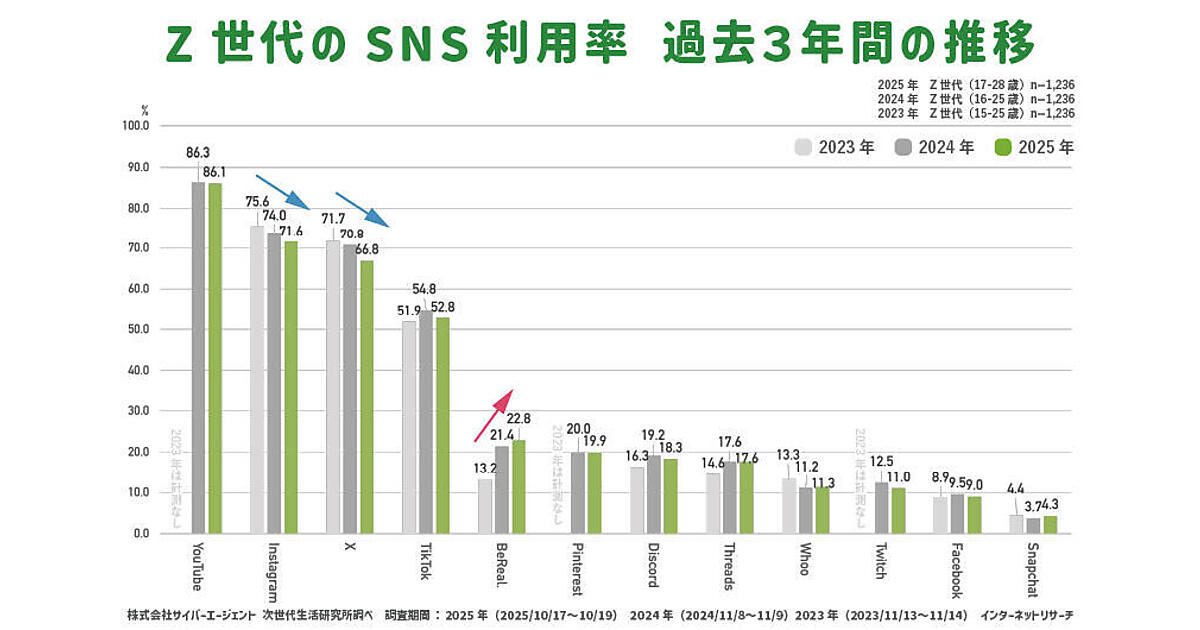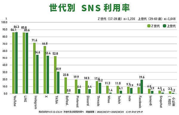 サイバーエージェントは、「サイバーエージェント次世代生活研究所」において、「2025年Z世代SNS利用率調査」を実施した。Z世代(17~28歳)のSNS利用状況を調べている。