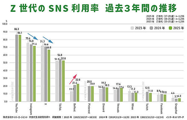 過去3年間のZ世代のSNS利用率推移を見ると、「YouTube」や「TikTok」などの動画系プラットフォームでは大きな変化は見られなかった。また、「Instagram」や「X」が減少傾向にある一方で、「BeReal.」は2023年13.2%、2024年21.4%、2025年22.8%と伸びており、唯一利用が拡大しているサービスとなった。