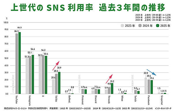 上世代についても推移を比較すると、比較的新しいSNSである「TikTok」と「Threads」が増加傾向にあることがわかった。一方で、「YouTube」や「Instagram」「X」はほぼ横ばいとなり、高止まりの状態が続いていた。