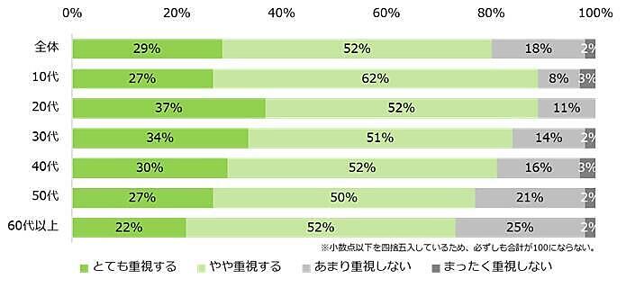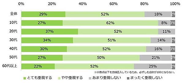 「仕事を選ぶ際、職場のルール(服装、髪型、働き方など)の自由度をどの程度重視しますか?」と聞くと、「とても重視する」29%、「やや重視する」52%で、計81%が重視。年代別で見ると、10代・20代がもっとも多く(10代:89%、20代:89%)、60代以上(74%)と15ポイントの差があった。