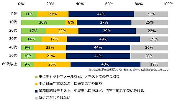最後に「職場の“コミュニケーション”について望ましい手法」を聞くと、「業務連絡はテキスト、相談事は口頭など、内容に応じて使い分ける」44%。年代別だと、10代が「主にチャットやメールなど、テキストでのやり取り」30%を好む傾向が見られた。