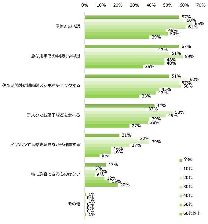 「勤務中の“働き方・過ごし方”について許容できるもの」では、「同僚との私語」「急な用事での中抜けや早退」同率57%が最多。年代別では、10代のみ「休憩時間外に短時間スマホをチェックする」62%が最多だった。