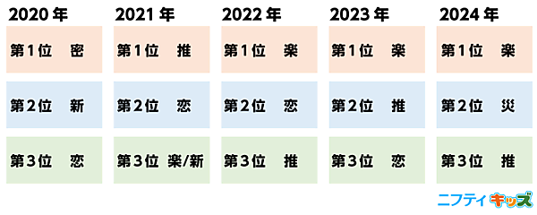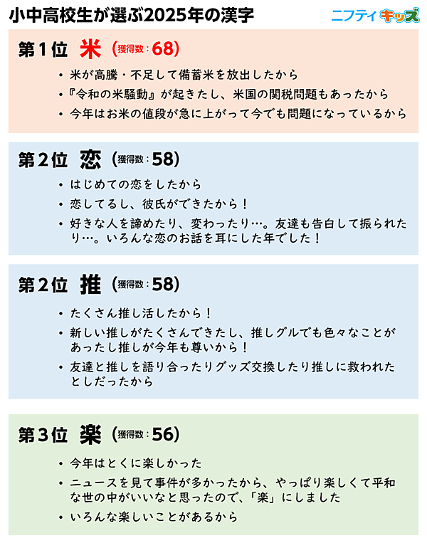 2位は「恋」と「推」が同率でランクイン。「恋」は昨年の4位から順位を上げ、「好きな人ができたから」といった声も寄せられた。また、“推し活”の広がりもうかがえ、子どもたちの関心がいっそう多様化していることがわかった。
