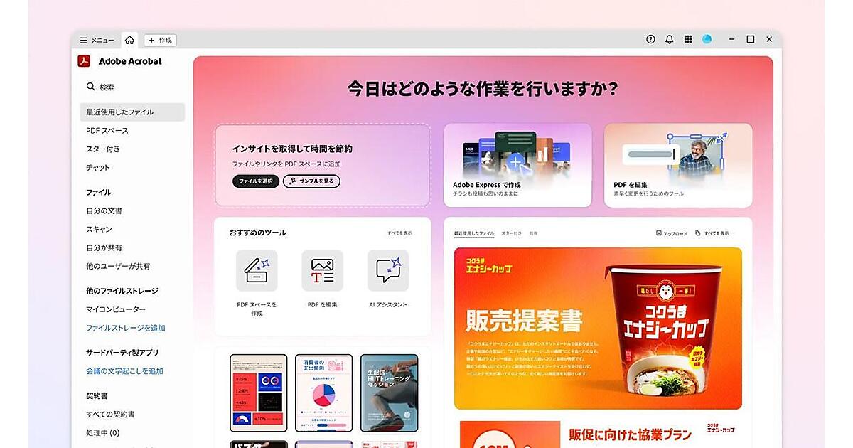 Adobe Express Premiumは全機能とアセットにアクセス可能。プロがデザインしたテンプレートを活用してAdobe Acrobatの画面上で「画像を生成」「画像を編集」「画像の背景を削除」などを活用してコンテンツを素早く簡単に作成、共有できる。Acrobat Proの最高水準のPDF機能が統合されているので、PDFの編集、ファイル結合、紙文書のスキャン、契約書や合意書への電子署名、墨消し、比較、保護など幅広い作業に対応する。