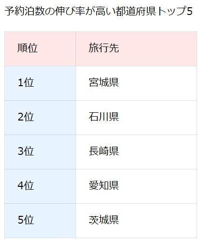 それによると「楽天トラベル」の国内予約泊数は、前年同期を上回り好調に推移。宿泊構成別では、女性複数名や女性1人の伸びが高いという。予約泊数が前年より伸びている「人気上昇都道府県」は、1位が「宮城県」で、「石川県」「長崎県」がそれに続いた。伸び率はいずれも前年の約1.2倍とのこと。