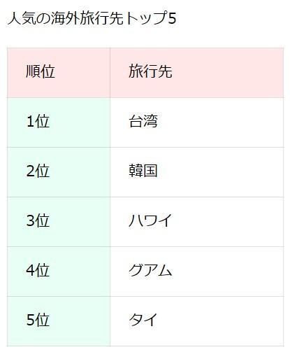 一方で海外旅行の人気先は、アクセスが良いアジア圏が好調。1位「台湾」、2位「韓国」が、近場での気軽さに加え、旅費も比較的抑えやすいことから上位となった。3位は、年末年始期間も温暖な「ハワイ」がランクインした。