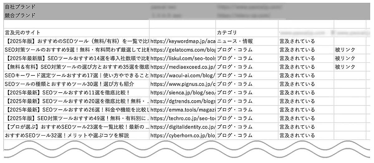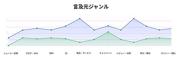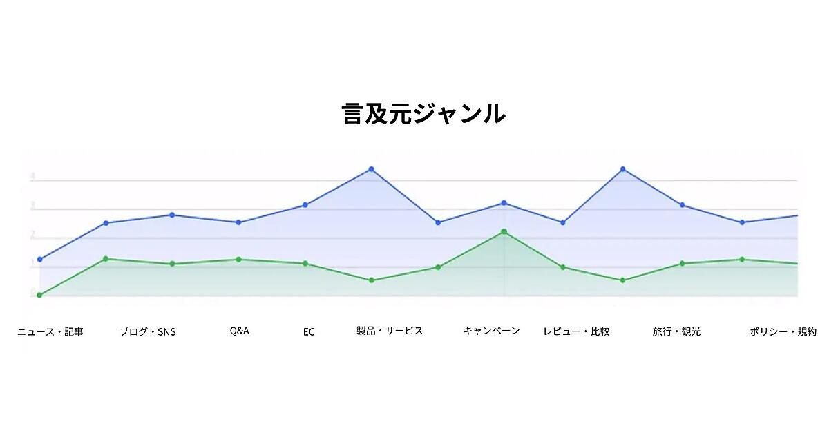 サイテーション分析はニュース、ブログ、SNS、ECなど多様なジャンルごとに、自社ブランドと競合のブランドが「どこで、どれだけ言及されているか」を自動で分類する。自社と競合を並べて比較して、強い領域と弱い領域が明確になる。「競合は多く言及されているのに自社は少ない」ジャンルが一目で分かり、例えば「ニュースメディアへの露出を強化する」「比較サイトへの掲載を増やす」など具体的で戦略的な施策・提案が可能になる。